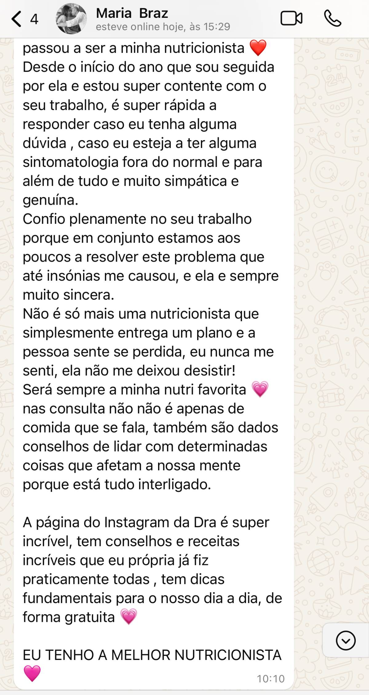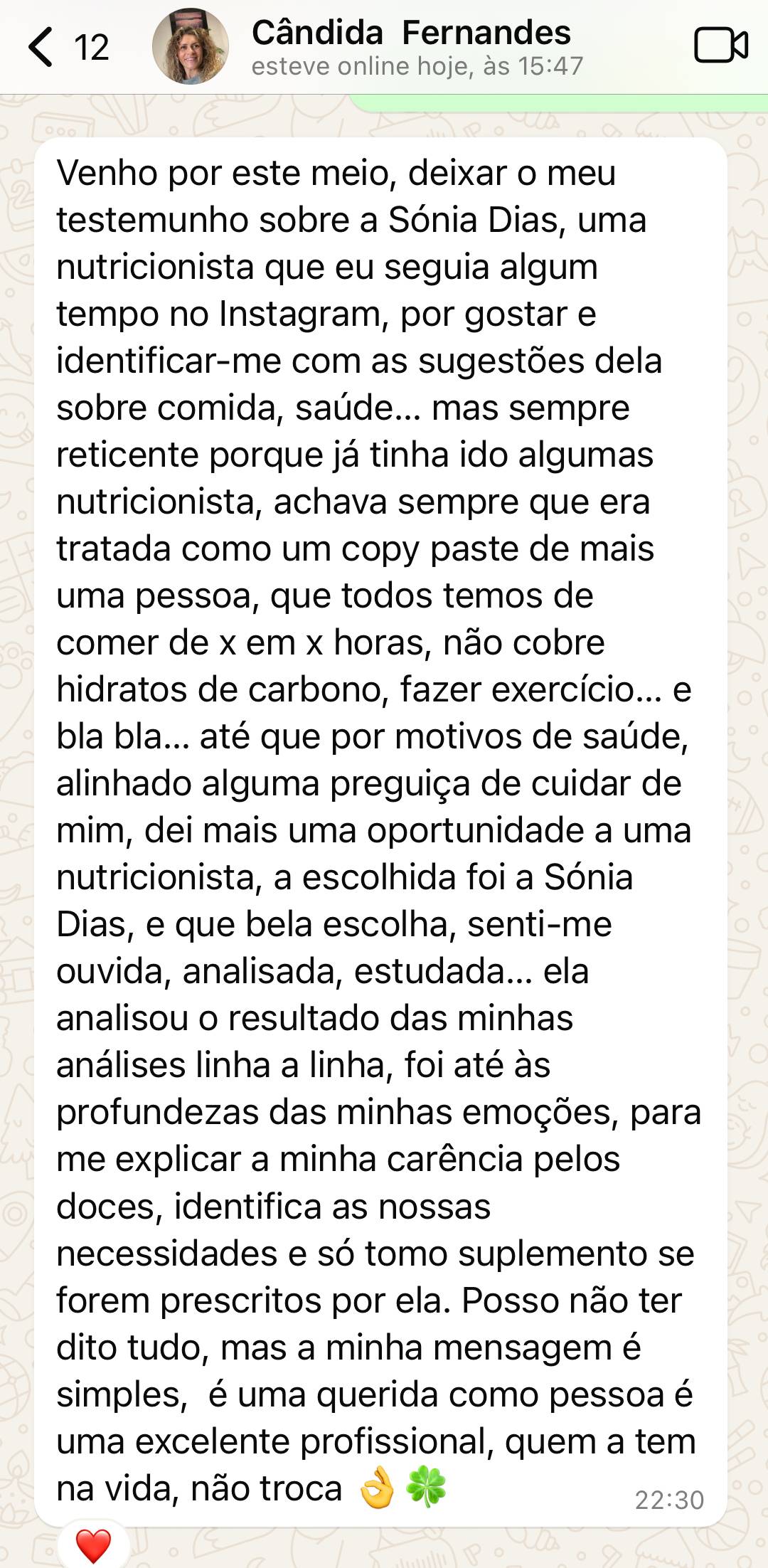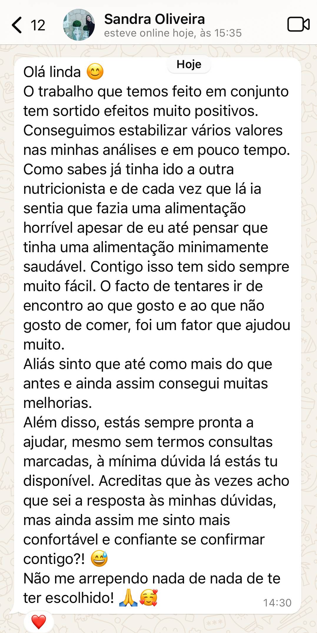 Desde 2014 já ajudei muitas mulheres a terem uma relação mais saudável com a comida, com o seu corpo e um melhor estilo de vida através das minhas consultas individuais e isso deixa-me muito contente e realizada.